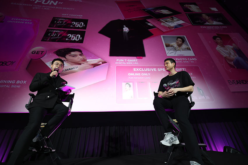 สำหรับแคมเปญเปิดตัวแบรนด์แอมบาสเดอร์นี้ EVEANDBOY จัดไอเทมสุดพรีเมียม EVEANDBOY UNIVERSE BAG x MARK TUAN SHINING BOX รวมสินค้าความงาม และเครื่องสำอางจากแบรนด์ชั้นนำกว่า 40 แบรนด์ อาทิ SULWHASOO, ESTEE LAUDER, CLINIQUE, M·A·C Cosmetics, BOBBI BROWN, ORIGINS, VICHY, EUCERIN, PHYSIOGEL, ANESSA, 4U2, MADAME LOUISE, BENICE,LESASHA ฯลฯ ให้ลูกค้าได้รับประสบการณ์ความสวยความงามด้วยผลิตภัณฑ์คุณภาพ และพร้อมก้าวสู่ความท้าทายใน ทุกๆ วันได้อย่างมั่นใจ