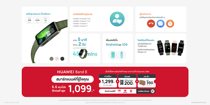 หัวเว่ย คอนซูมเมอร์ บิสสิเนส กรุ๊ป (ประเทศไทย) เปิดตัวสมาร์ทแบนด์รุ่นล่าสุด HUAWEI Band 8 เจเนอเรชั่นใหม่ที่มาพร้อมการออกแบบที่บางและน้ำหนักเบา การตรวจสอบสุขภาพที่ครอบคลุมรอบด้านรวมถึงขณะนอนหลับ คุณสมบัติด้านฟิตเนสกับโหมดออกกำลังกายใหม่ และอายุการใช้งานแบตเตอรี่ที่ยาวนานสูงสุด 2 สัปดาห์[1] HUAWEI Band 8 วางจำหน่ายในราคาพิเศษ 1,299 จากราคาปกติ 1,899 เมื่อสั่งซื้อตั้งแต่วันที่ 6 มิถุนายน 2566 ถึง 8 มิถุนายน 2566 ที่ช่องทางออนไลน์ HUAWEI Online Store และร้านค้าออนไลน์อย่างเป็นทางการของหัวเว่ยบนช่องทาง Shopee และ Lazada