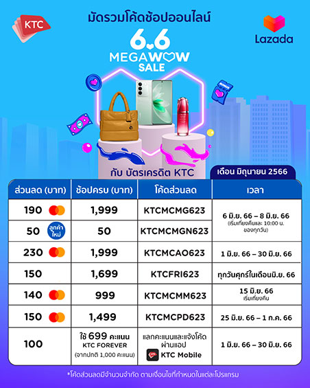 “แคมเปญที่ 2 Lazada 6.6 Mega Wow Sale ระหว่างวันที่ 6-8 มิถุนายน 2566 สิทธิพิเศษนี้เพื่อสมาชิกบัตรเครดิตเคทีซีมาสเตอร์การ์ดทุกประเภท รับส่วนลด 190 บาท เมื่อช้อปออนไลน์ผ่าน www.lazada.co.th หรือแอปฯ Lazada ตั้งแต่ 1,999 บาทขึ้นไปต่อรายการซื้อสุทธิ โดยระบุรหัสส่วนลด KTCMCMG623 ก่อนการชำระเงิน พิเศษ สมาชิกบัตรเครดิต เคทีซีมาสเตอร์การ์ดที่ช้อปออนไลน์ครั้งแรกกับ Lazada ผ่านแอปฯ Lazada รับส่วนลดทันที 50 บาท โดยระบุรหัสส่วนลด KTCMCMGN623 ก่อนชำระเงิน”