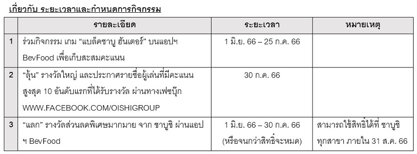 ฟิตนิ้วมือให้พร้อม แล้วมาประลองความไวและแม่นยำ ผ่านภารกิจพิเศษ เกม “แบล็คชาบู ฮันเตอร์” ได้ทุกที่ ทุกเวลา พร้อมเปิดเกม ล่า - ลุ้น - แลก ทองคำแท่งและรางวัลส่วนลดพิเศษมากมาย รวมมูลค่ากว่า 1,000,000 บาท ตั้งแต่ 1 มิถุนายน 2566 – 30 กรกฎาคม 2566 โดยสามารถติดตามข่าวสารและเงื่อนไขกิจกรรมได้ที่ เฟซบุ๊ก OISHI Restaurant Thailand : WWW.FACEBOOK.COM/OISHIGROUP หรือ https://oishifood.com/page/blackshabuhunter/