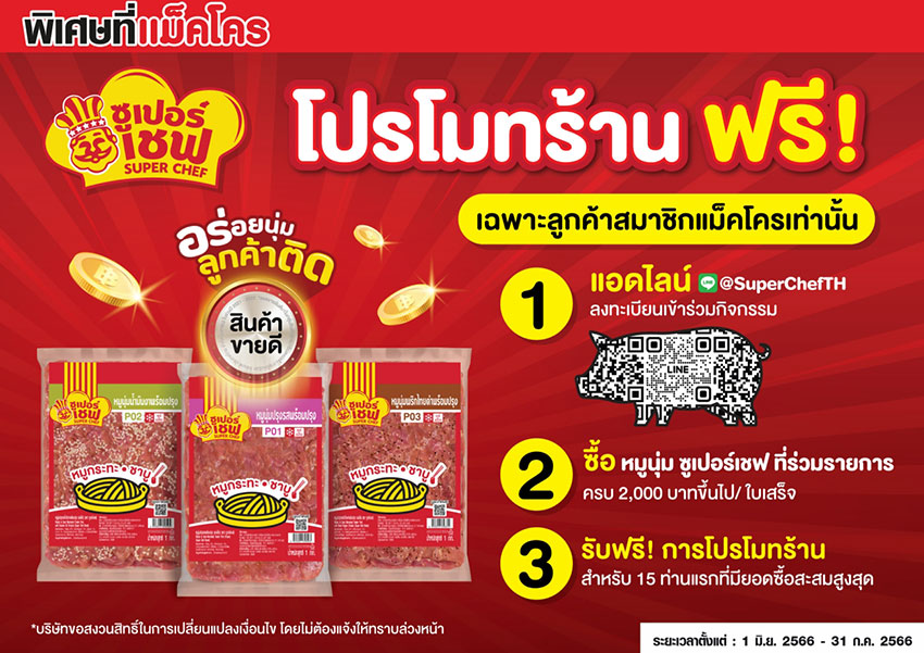 แคมเปญ ‘อร่อยนุ่มลูกค้าติด!’ เป็นกิจกรรมที่ต้องการส่งเสริมให้ผู้ประกอบการร้านอาหารเป็นที่รู้จักและลูกค้าติด ด้วยเคล็ดลับฉบับมือโปร โดยคัดเลือกผู้ประกอบการที่มียอดซื้อสินค้าหมูนุ่ม แบรนด์ ซูเปอร์เชฟ ผ่านช่องทางแม็คโคร (Makro) สะสมสูงสุด 15 ท่าน จะได้รับโฆษณารีวิวธุรกิจฟรี! เพื่อสร้างการรับรู้ในแพลตฟอร์มดัง อย่าง Facebook, Youtube และ Tiktok มูลค่ารวมกว่า 2 ล้านบาท กติกาง่ายๆ เพียงแอดไลน์ @Superchefth เพื่อลงทะเบียน และสะสมยอดซื้อระหว่างวันนี้ – 31 กรกฎาคม 2566 สอบถามรายละเอียดเพิ่มเติม ทาง Line Official และ Facebook Page : SuperChefTH