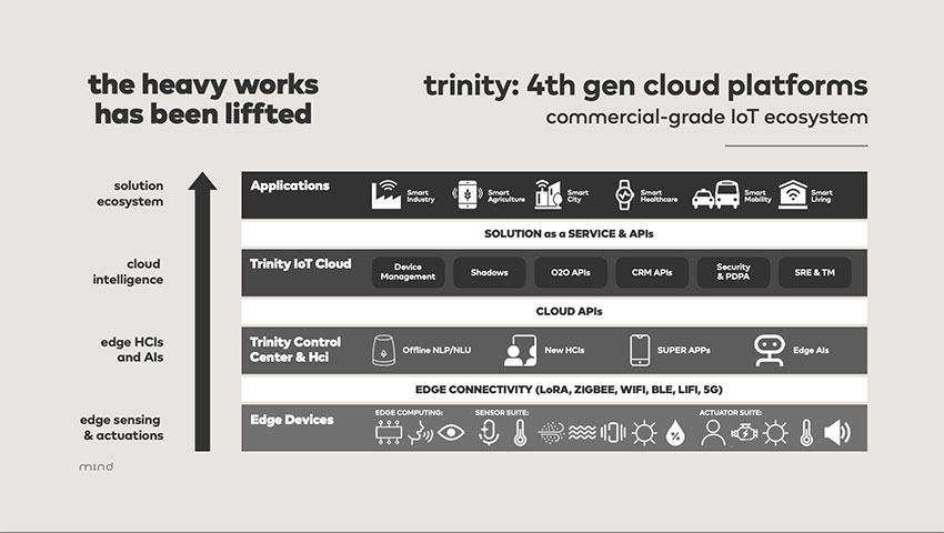 ทั้งนี้ Smart Home Solutions ภายใต้แบรนด์ mind ประกอบด้วย mind Solutions โซลูชันอัจฉริยะรูปแบบ Mobile App และ Home App เชื่อมต่อสั่งการทุกอุปกรณ์ Smart Home พร้อมประสานกับทีมงานมืออาชีพ ดูแลทั้งก่อนและหลังการขายตลอด 24 ชั่วโมง และ mind Device อุปกรณ์ IoT (Internet of Things) โดยออกแบบแพ็กเกจให้บริการด้าน Smart Home Solutions ตอบโจทย์การใช้ชีวิต 4 รูปแบบ ซึ่งผู้บริโภคสามารถปรับแต่งเพิ่มเติมได้ตามความต้องการ ได้แก่