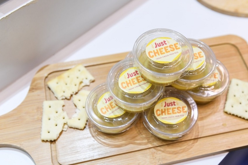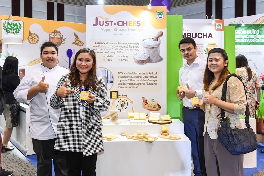 ภายในบูธของ CPF RD Center นำเสนอ 3 ผลงานวิจัยด้านอาหาร ประกอบด้วย Just-Cheese ชีสวีแกนทำจากปลายข้าวหมักด้วยกระบวนการชีวภาพด้วยเชื้อยีสต์สายพันธ์คัดแยกพิเศษที่ให้กลิ่นและอะมิโน เป็นผลพลอยได้จากกระบวนการสีข้าวที่มีมูลค่าน้อยลง แต่ยังอุดมด้วยโปรตีน แร่ธาตุ ไขมัน และวิตามิน การแปรรูปเป็น “ชีส” ไขมันต่ำ มีคุณค่าโภชนาการสูง ช่วยตอบโจทย์คนรุ่นใหม่ที่ชื่นชอบชีส และผู้ที่รับประทานมังสวิรัติ ขณะเดียวกัน ยังมีรสชาติอร่อยเหมือนชีสที่ทำจากนม เพิ่มทางเลือกให้กับผู้ที่แพ้นม ได้อีกด้วย