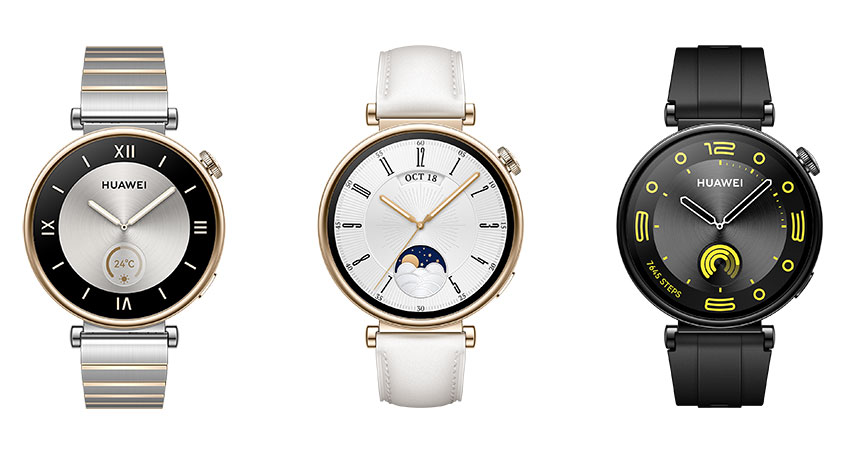 HUAWEI WATCH GT 4 ขนาด 41 มม. โดดเด่นด้วยดีไซน์ดุจเครื่องประดับ (จากซ้ายไปขวา) ตัวเรือนสีเงินกับสายแบบสวม ดีไซน์สองสีเหมือนคีย์เปียโน, ตัวเรือนสีขาวกับสายหนังสีขาว, และตัวเรือนสีดำสายฟลูออโรอีลาสโตเมอร์สีดำ
