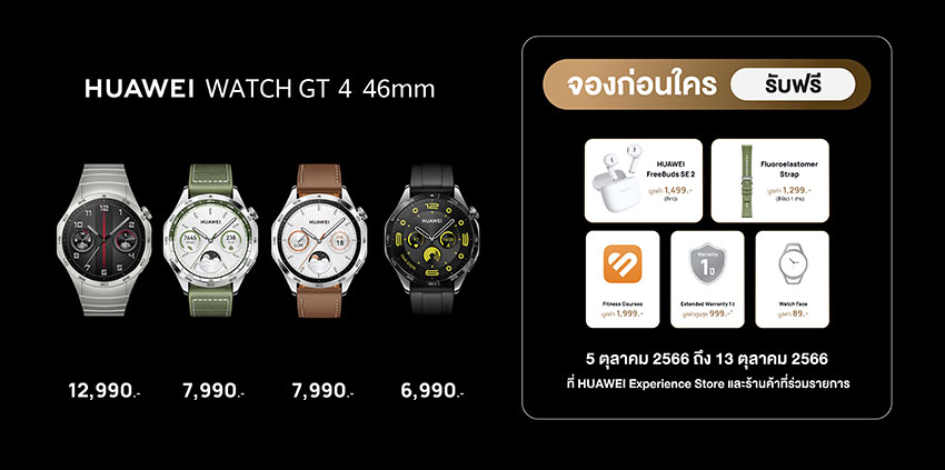 หัวเว่ย คอนซูมเมอร์ บิสสิเนส กรุ๊ป (ประเทศไทย) ประกาศเปิดตัว HUAWEI WATCH GT 4 Series อย่างเป็นทางการ พร้อมโปรโมชันพรีออเดอร์โดยเปิดโอกาสให้ลูกค้าได้เป็นเจ้าของสมาร์ทวอทช์แฟชั่นระดับพรีเมียมในราคาสุดพิเศษเริ่มต้นเพียง 6,990 บาท สามารถพรีออเดอร์ล่วงหน้าได้ตั้งแต่วันที่ 5 ตุลาคม 2566 - 13 ตุลาคม 2566 ผู้ที่หลงใหลในนวัตกรรมห้ามพลาดกับโอกาสที่จะได้เป็นหนึ่งในคนกลุ่มแรกๆ ที่จะได้สัมผัสกับอนาคตของเทคโนโลยีในสมาร์ทวอทช์พร้อมคุณสมบัติล้ำสมัยอีกมากมาย