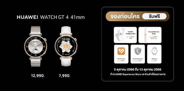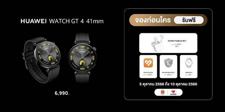 - HUAWEI WATCH GT 4 ขนาด 41 มม. สีดำ สายฟลูออโรอีลาสโตเมอร์ ในราคาเพียง 6,990 บาท วางจำหน่ายที่ช่องทางออนไลน์บนร้านค้าอย่างเป็นทางการของหัวเว่ยบนแพลตฟอร์ม Lazada และ Shopee
