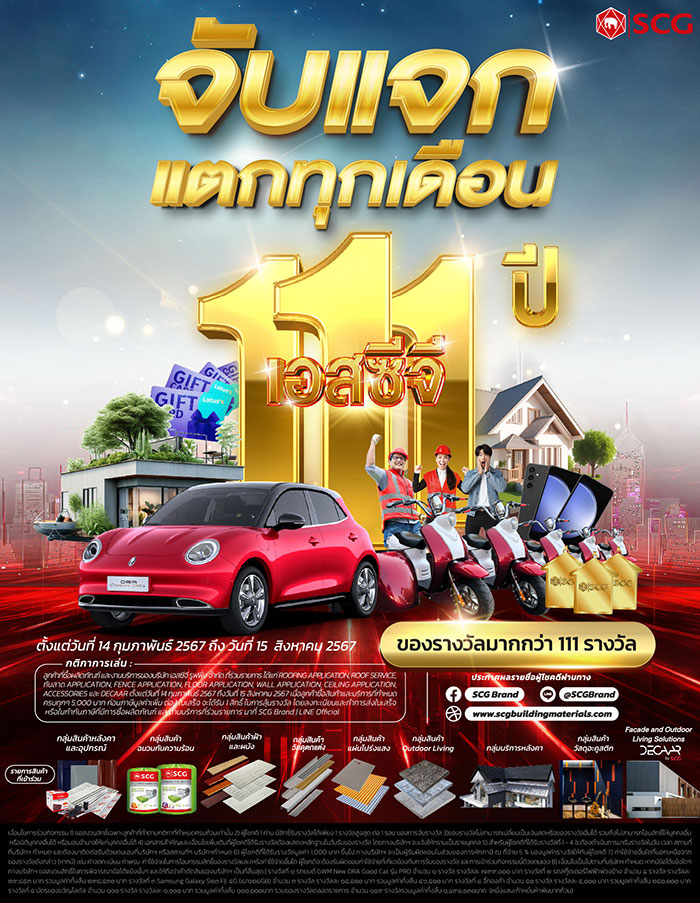 เอสซีจี ผู้นำด้านนวัตกรรมวัสดุก่อสร้างครบวงจร เดินหน้าส่งแคมเปญใหญ่แห่งปี “111 ปี เอสซีจี จับแจกแตกทุกเดือน” ในโอกาสฉลองครบรอบ 111 ปี เอสซีจี จับแจกทั่วไทยแจกใหญ่ทุกภาคทั่วประเทศ เริ่ม! 14 กุมภาพันธ์ 2567 - 15 สิงหาคม 2567 ของรางวัลมากกว่า 111 รางวัล รวมมูลค่ากว่า 1.5 ล้านบาท