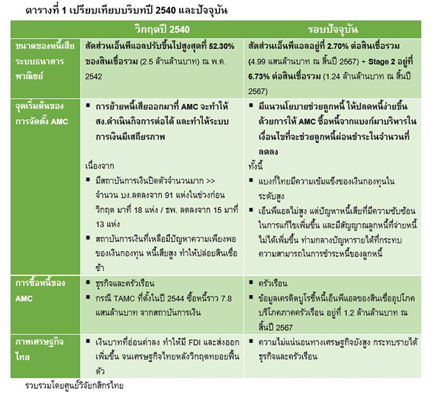 - แม้จุดเริ่มต้นของแนวคิดการจัดตั้ง AMC ทั้งในช่วงวิกฤตต้มยำกุ้งและในครั้งนี้ มีความเหมือนกันตรงที่การมุ่งแยกหนี้เสียออกจากระบบ แต่กลับอยู่บนเงื่อนไขของเศรษฐกิจการเงินที่แตกต่างกัน ทั้งนี้ ในช่วงวิกฤตปี 2540 การจัดตั้ง AMC จะเน้นซื้อหนี้ทั้งธุรกิจและครัวเรือน ซึ่งการฟื้นตัวของเศรษฐกิจหลังวิกฤตจากอานิสงส์ของเงินบาทอ่อนค่าที่ส่งผลดีต่อ FDI และการส่งออก ได้ช่วยให้ธุรกิจและครัวเรือนเห็นภาพรายได้ที่ดีขึ้น นอกจากนี้ ในระยะเวลาดังกล่าว ยังเป็นช่วงแรกๆ ของตลาดการบริหารหนี้ และมีการแก้กฎหมาย มีการจัดตั้งศาลล้มละลายกลาง จึงทำให้การแก้ไขปัญหาหนี้มีองค์ประกอบหลายด้านที่สนับสนุนการแก้ไขหนี้เป็นไปในทิศทางที่ดีขึ้นด้วยเช่นกัน