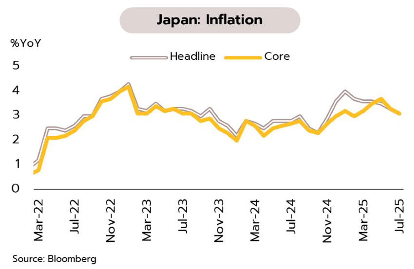 ภาคบริการช่วยประคับประคองเศรษฐกิจญี่ปุ่น แต่ภาคการผลิตและส่งออกยังเป็นปัจจัยฉุดรั้งการเติบโต ในเดือนกรกฎาคม ยอดส่งออกหดตัวมากสุดในรอบ 4 ปีที่ -2.6% YoY ขณะเดียวกันจำนวนผู้ที่เดินทางเข้ามาในญี่ปุ่นเพิ่มขึ้น 4.4% YoY สู่ระดับ 3.4 ล้านคน ด้านกระทรวงการคลังเตรียมปรับขึ้นอัตราดอกเบี้ยอ้างอิงในคำของบปี 2569-2570 ที่ใช้เป็นฐานในการคำนวณสำหรับพันธบัตรรัฐบาลระยะยาวสู่ระดับสูงสุดในรอบ 17 ปี ที่2.6% ซึ่งส่งผลให้การตั้งงบชำระหนี้สูงสุดเป็นประวัติการณ์ที่ราว 30 ล้านล้านเยน