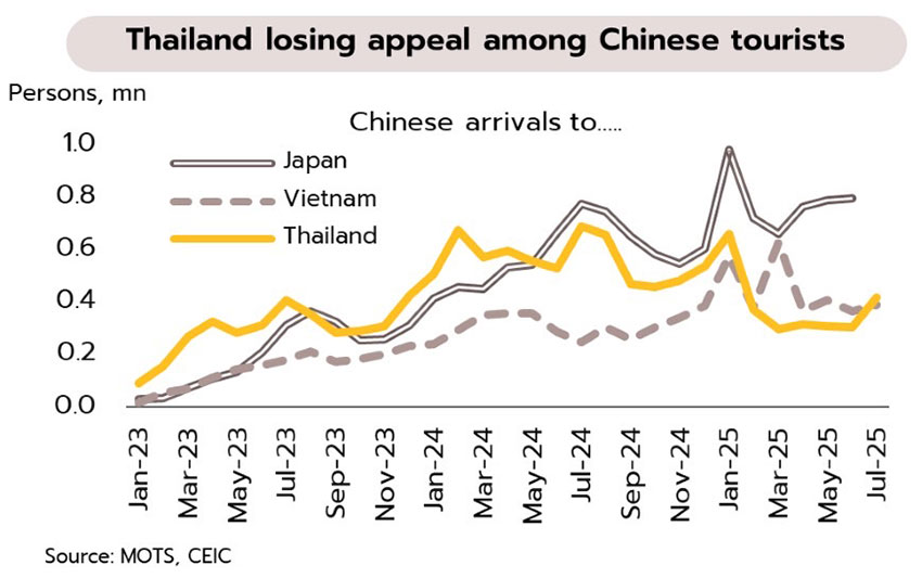 ภาคท่องเที่ยวของไทยยังเผชิญปัจจัยลบสำคัญจากจำนวนนักท่องเที่ยวจีนที่ต่ำกว่าปีที่แล้วท่ามกลางความกังวลด้านความปลอดภัย ในช่วง 7 เดือนแรกของปี นักท่องเที่ยวจีนลดลง -34.9% YoY เหลือเพียง 2.62 ล้านคน หรือประมาณ 40% ของระดับก่อนโควิด-19 ในปี 2562 ขณะเดียวกันไทยยังเผชิญการแข่งขันที่รุนแรงจากประเทศคู่แข่งในเอเชีย โดยเฉพาะญี่ปุ่นและเวียดนามที่สามารถดึงดูดนักท่องเที่ยวจีนปัจจัยดังกล่าวทำให้ภาคท่องเที่ยวไทยในปีนี้ยังไม่สดใส ล่าสุดวิจัยกรุงศรีคาดว่านักท่องเที่ยวต่างชาติปี 2568 จะลดลงเหลือ 34 ล้านคน จาก 35.5 ล้านคนในปี 2567 ซึ่งถือเป็นการลดลงรายปีเป็นครั้งแรกนับตั้งแต่ปี 2564 หลังการระบาดของโควิด-19 ในปี 2563
