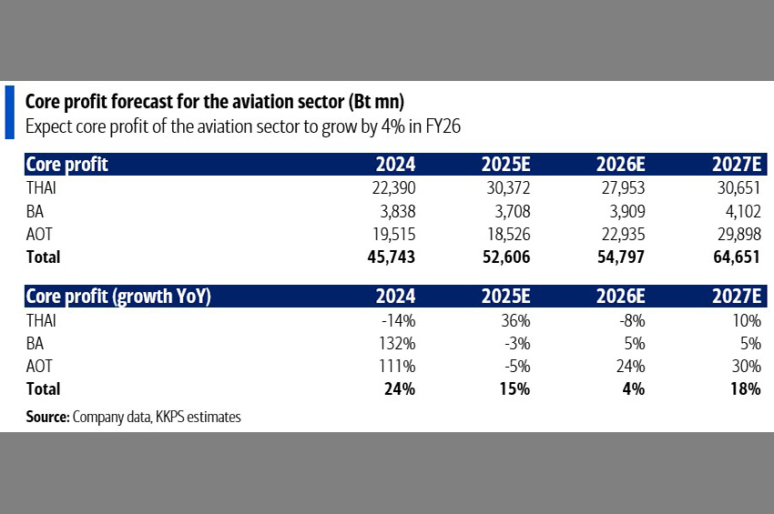 ภาคการบินของไทยควรได้รับประโยชน์จากจำนวนผู้โดยสารที่เพิ่มขึ้นราว 3-6% สำหรับ AOT บริษัทการบินไทย จำกัด (มหาชน) หรือ THAI และบริษัทการบินกรุงเทพ จำกัด (มหาชน) หรือ BA โดยกำไรของ AOT คาดว่าจะเพิ่มขึ้น 24% ในปีงบประมาณ 2026 หนุนโดยค่าบริการผู้โดยสารขาออกระหว่างประเทศ (PSC) ที่สูงขึ้น กำไรของ BA คาดว่าจะเติบโต 5% จากการโตอย่างต่อเนื่องของเส้นทางสมุย ในทางตรงกันข้าม กำไรของ THAI คาดว่าจะลดลง 8% จากต้นทุนที่สูงขึ้นและการแข่งขันที่รุนแรงขึ้น