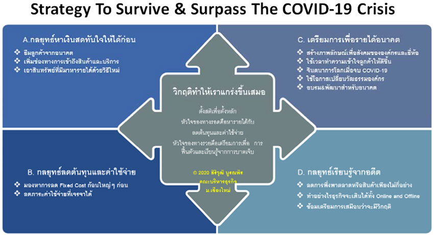 “การที่จะก้าวผ่านวิกฤติ COVID-19 ครั้งนี้ ให้ได้เป็นอย่างดี เราจำเป็นต้องมา “ตั้งสติ” เพื่อหาโมเดลสู่ความอยู่รอด เรียกว่า “หนทางรอด” แล้ว “ตั้งหลัก” เพื่อสร้างศักยภาพในการเติบโตอย่างก้าวกระโดดไปในอนาคต เรียกว่า “หนทางรวย” ซึ่งตอนนั้น (กลางเดือน เม.ย.2563) ผมได้แนะนำสิ่งที่เรียกว่า 'กลยุทธ์ทางรอดทางรวยจาก COVID-19 (Strategy to Survive & Surpass the COVID-19 Crisis)' ให้กับลูกศิษย์ไป"