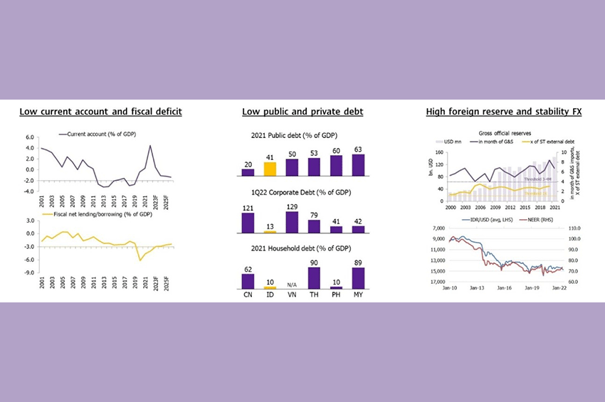 ในภาวะที่หลายประเทศทั่วโลกกำลังเผชิญความเสี่ยงเงินเฟ้อสูง แรงกดดันจากนโยบายการเงินที่ตึงตัว ท่ามกลางเศรษฐกิจโลกที่อาจจะชะลอตัวลง แต่ดูเหมือนว่าเสถียรภาพทางเศรษฐกิจและการเงินของอินโดนีเซียโดยรวมในปัจจุบันยังถือว่าอยู่ในระดับที่ดี แนวโน้มในระยะ 3 ปีข้างหน้าก็ยังไม่น่ากังวล หากพิจารณาจาก 1) ดุลบัญชีเดินสะพัดที่ในปี 2022 เกินดุล 4.5% ของ GDP ในระยะ 3 ปีข้างหน้าการขาดดุลอยู่ในระดับต่ำไม่เกิน 2% ของ GDP (คาดการณ์โดย IMF) ทั้งนี้ การขาดดุลบัญชีเดินสะพัดในระดับต่ำๆ ถือว่าเป็นเรื่องดีสำหรับประเทศกำลังพัฒนาที่ยังมีความต้องการลงทุนสูง เนื่องจากสะท้อนถึงสัดส่วนการลงทุนที่มีมากกว่าการออม บ่งชี้ศักยภาพการเติบโตของเศรษฐกิจในระยะข้างหน้า ขณะที่ดุลการคลังมีแนวโน้มปรับตัวดีขึ้นจากในอดีต (คาดการณ์โดย IMF)