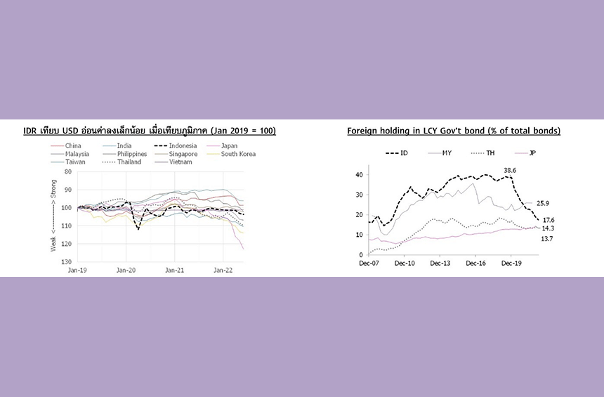 4) แรงกดดันจากนโยบายการเงินที่ตึงตัวจากประเทศชั้นนำ กดดันต่อตลาดเงินอินโดนีเซียไม่มากเท่ากับในอดีต ส่วนหนึ่งมาจากตลาดพันธบัตรของอินโดนีเซียมีสัดส่วนของนักลงทุนต่างชาติลดลงค่อนข้างมากเมื่อเทียบกับในอดีต ซึ่งมาจากการเข้าซื้อพันธบัตรของธนาคารกลางอินโดนีเซียในช่วงที่ประเทศกำลังเผชิญวิกฤตโรคระบาด COVID-19