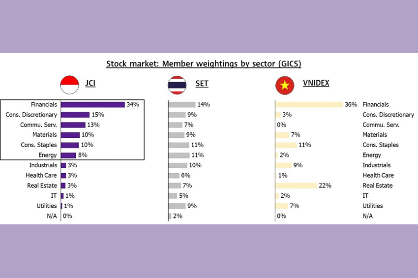 โครงสร้างตลาดหุ้นอินโดนีเซียในแง่ของ market capitalization มีหุ้นในกลุ่มธุรกิจการเงินเป็นกลุ่มหลัก รองลงมาจะกระจายตัวอยู่ในกลุ่ม Consumer discretionary กลุ่มสื่อสาร กลุ่ม Material และ Consumer staples นอกจากนี้ มูลค่าตลาดยังกระจุกตัวอยู่ในหุ้น 10 บริษัทแรก ซึ่งมีสัดส่วนอยู่ 50% ของมูลค่าตลาด คล้ายคลึงกับตลาดเวียดนาม โดยกลุ่มธุรกิจการเงินมีมูลค่าในตลาดหุ้นอินโดนีเซียถึง 1 ใน 3 เช่นเดียวกันกับตลาดหุ้นในเวียดนาม แม้ว่าในกลุ่มธุรกิจการเงินจะมีหุ้นอยู่ในกลุ่มกว่า 100 บริษัท แต่เกือบ 70% ของมูลค่าของกลุ่มมาจากธนาคารขนาดใหญ่ 3 แห่ง คือ Bank Rakyat Indonesia, Bank Central Asia และ Bank Mandiri