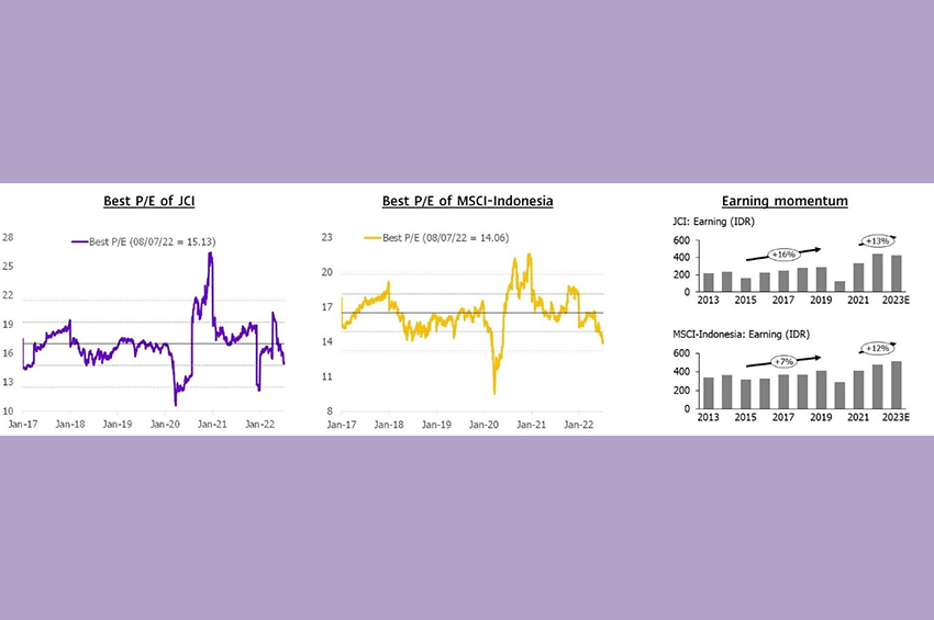 โดยรวมเรามีมุมมองเป็น Slightly positive ต่อตลาดหุ้นอินโดนีเซีย มูลค่าตลาดหุ้นอินโดนีเซียยังมีความน่าสนใจ หากพิจารณาจาก Forward P/E ที่อยู่ในระดับต่ำเมื่อเทียบกับค่าเฉลี่ย 5 ปี โดยแนวโน้มของ Earning ในตลาดหุ้นอินโดนีเซียยังเติบโตได้ดี โดยเฉพาะในกลุ่มหุ้น Large และ Mid cap ล่าสุด MSCI-Indonesia มี valuation ในด้าน Forward P/E อยู่ในระดับ 14x โดยอยู่ในระดับที่ค่อนข้างถูก (-1.4 sd) เมื่อเทียบกับค่าเฉลี่ย 5 ปีที่ผ่านมา ขณะที่แนวโน้มการเติบโตของกำไรในปี 2022-23 มีโอกาสเร่งตัวขึ้นอยู่ที่เฉลี่ย 12% ต่อปีเมื่อเทียบกับช่วงก่อน COVID-19 ซึ่งขยายตัวเพียง 7% ต่อปี
