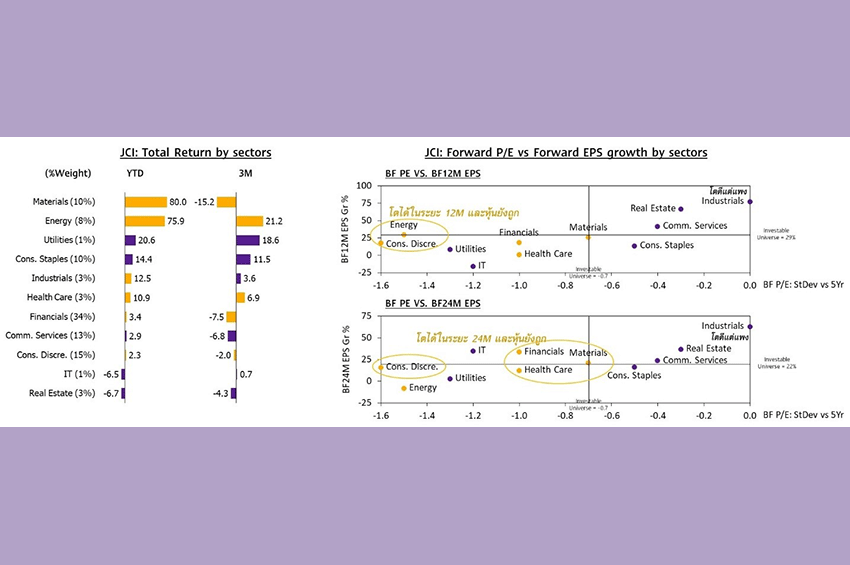 หากพิจารณาในแง่ Market cap, Return, EPS และ P/E รวมถึงปัจจัยพื้นฐานที่สนับสนุนกลุ่ม Sector ต่างๆ จะพบว่า กลุ่ม Sectors ที่น่าสนใจสำหรับการลงทุนในตลาดหุ้นอินโดนีเซีย แบ่งเป็น 2 กลุ่มใหญ่ ได้แก่ 1) กลุ่มธุรกิจการเงิน กลุ่มสุขภาพ และกลุ่ม Consumer discretionary ที่ได้รับปัจจัยบวกจากการเติบโตของการบริโภคของครัวเรือน โดยเฉพาะในกลุ่มชนชั้นกลาง และการขยายตัวของธุรกิจบริการ โดยเฉพาะกลุ่มเศรษฐกิจใหม่อย่างธุรกิจ Platform และ 2) กลุ่มพลังงานและกลุ่ม Material ที่ได้อานิสงส์จากราคาสินค้าโภคภัณฑ์ที่ยังอยู่ในระดับสูง แต่ในระยะสั้นผลบวก เริ่มมีข้อจำกัดจากแนวโน้มราคาสินค้าโภคภัณฑ์ที่กำลังเข้าสู่ระดับสูงสุด อย่างไรก็ตาม ในระยะกลาง การลงทุนในประเทศที่คาดว่าจะขยายตัวได้ต่อเนื่อง โดยเฉพาะที่เกี่ยวข้องกับรถยนต์ EV น่าจะเป็นปัจจัยสนับสนุนในกลุ่ม Material