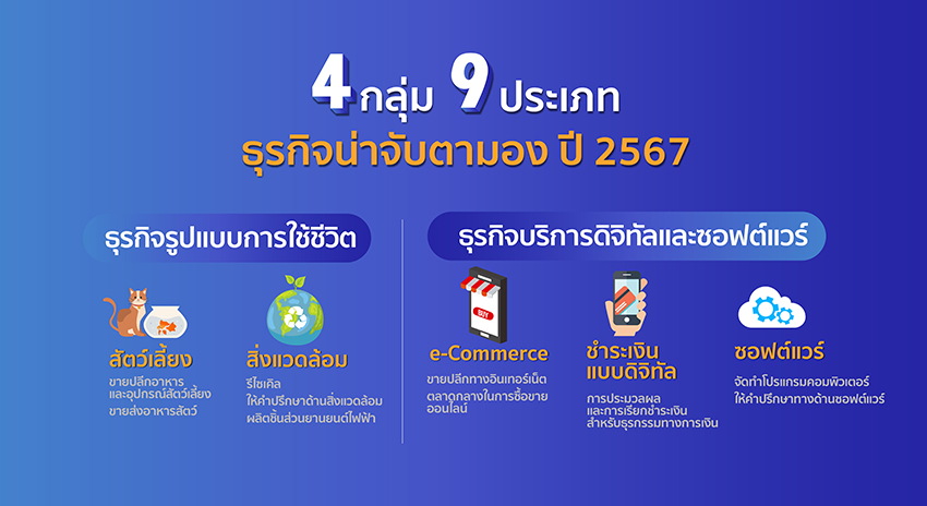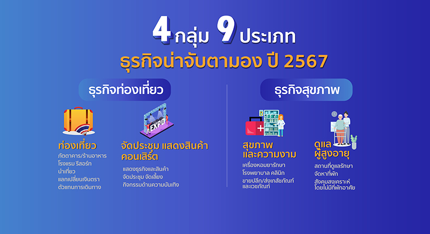 อธิบดีอรมน กล่าวต่อว่า จากผลการวิเคราะห์ สามารถแบ่งกลุ่มธุรกิจที่น่าจับตามองและน่าสนใจในปี 2567 ออกเป็น 4 กลุ่มธุรกิจ 9 ประเภทธุรกิจ ประกอบด้วย
