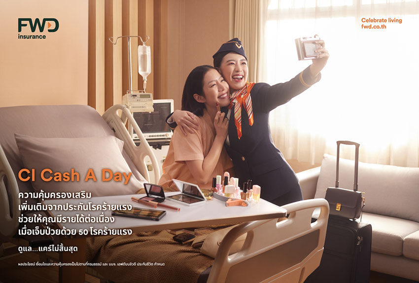 ภาพยนตร์เรื่อง CI Cash A Day ดูแล...รายได้ไม่สะดุด เรื่องราวความผูกพันและการดูแลซึ่งกันและกันของเพื่อนสนิทที่คอยดูแลกันมาในทุกช่วงเวลาแม้ในระหว่างการเจ็บป่วย แสดงให้เห็นถึงความเอาใจใส่และการสนับสนุนอย่างเสมอมาในเวลาที่เพื่อนต้องการการดูแล เช่นเดียวกับ CI Cash A Day โดย FWD ประกันชีวิต ที่ยังคงให้การดูแลแม้ในช่วงเวลาที่ยากลำบากด้วยการเพิ่มค่าชดเชยรายได้เมื่อเข้ารับการรักษาเป็นผู้ป่วยในของโรงพยาบาลจากการเจ็บป่วยด้วยโรคร้ายแรง เพิ่มความอุ่นใจในทุกช่วงเวลาของชีวิต