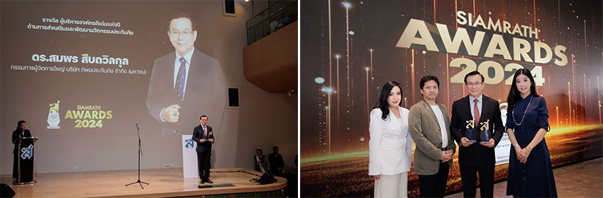 ดร.สมพร สืบถวิลกุล ประธานเจ้าหน้าที่บริหาร บริษัท ทิพย กรุ๊ป โฮลดิ้งส์ จำกัด (มหาชน) และกรรมการผู้จัดการใหญ่ บริษัท ทิพยประกันภัย จำกัด (มหาชน) เข้ารับ 2 รางวัลแห่งความภาคภูมิใจ ในงานสยามรัฐออนไลน์ อวอร์ด ประจำปี 2567 ได้แก่ รางวัลผู้บริหารองค์กรดีเด่นแห่งปีด้านการส่งเสริมและพัฒนานวัตกรรมประกันภัย และรางวัลบริษัทประกันภัยที่ส่งเสริมความยั่งยืนด้านการพัฒนาสังคมยอดเยี่ยม โดยผลรางวัลมาจากผลการรวบรวมข้อมูลจากประชาชนตลอดระยะเวลา 1 ปี ที่ผ่านมา ใช้ฐานอ้างอิงข้อมูลจาก Platform BRAND24 และ Google Trend โดยงานนี้จัดขึ้น ณ True Digital Park