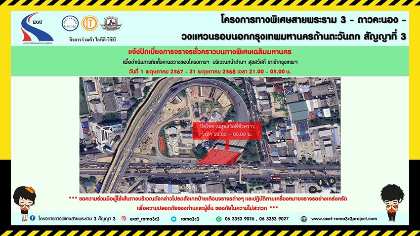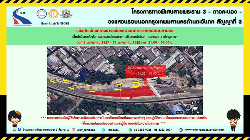 การทางพิเศษแห่งประเทศไทย (กทพ.) กระทรวงคมนาคมได้ว่าจ้าง กิจการร่วมค้า ไอทีดี-วีซีบี (ITD-VCB Joint Venture) ประกอบด้วย บริษัท อิตาเลียนไทย ดีเวล๊อปเมนต์ จำกัด (มหาชน) และบริษัท วิจิตรภัณฑ์ก่อสร้าง จำกัด เป็นผู้รับจ้างดําเนินการก่อสร้าง โครงการทางพิเศษสายพระราม3 – ดาวคะนอง - วงแหวนรอบนอกกรุงเทพมหานครด้านตะวันตกสัญญาที่ 3 แจ้งการปิดเบี่ยงการจราจรชั่วคราวบนทางพิเศษเฉลิมมหานคร เพื่อดำเนินการติดตั้งชิ้นส่วนทางวิ่งยกระดับของโครงการฯ จำนวน 3 แห่งตั้งแต่วันที่ 1 พฤษภาคม 2567 ถึง 31 พฤษภาคม 2568 ตั้งแต่เวลา 21.00 น.- 05.00 น. ดังนี้