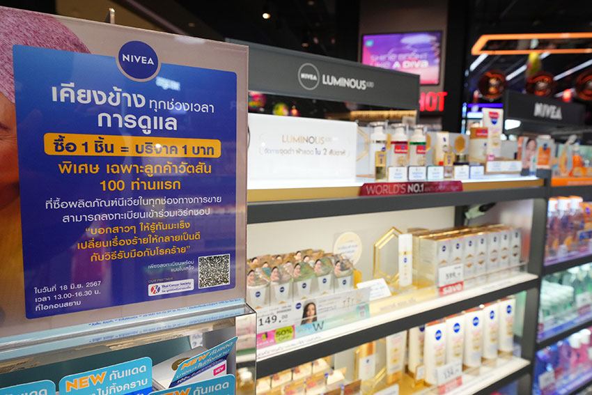 “มะเร็ง” โรคที่เป็นสาเหตุการเสียชีวิตอันดับต้น ๆ ของประชากรทั่วโลก และการดูแลไม่ใช่เพียงการรักษาทางการแพทย์ แต่ยังรวมถึงการดูแลและการแสดงถึงความเข้าใจและห่วงใย ลูกค้านีเวียและวัตสัน สามารถร่วมเป็นส่วนหนึ่งในการสร้างพลังใจให้แก่ผู้ป่วยได้เข้าถึงการดูแลสุขภาพใจควบคู่ไปกับการรักษาเพื่อคุณภาพชีวิตที่ดีกว่าได้แล้ว เพียงซื้อผลิตภัณฑ์นีเวีย ทั้งทางช่องทางออนไลน์ และหน้าร้านวัตสันทุกสาขาทั่วประเทศ ตั้งแต่วันนี้ถึง 22 พฤษภาคม 2567 โดยทุก 1 ชิ้น นีเวีย บริจาค 1 บาท ให้แก่มูลนิธิเครือข่ายมะเร็ง เพื่อใช้ในกิจกรรมการดูแลและสนับสนุนผู้ป่วยมะเร็งและครอบครัวให้ตระหนักรู้และเข้าใจโรคมะเร็ง สามารถดูแลรักษาตนเองได้อย่างถูกต้อง รวมถึงกิจกรรมที่สร้างกำลังใจให้ผู้ป่วยและผู้ดูแลผู้ป่วยมะเร็ง ให้มีแรงใจสามารถต่อสู้กับโรคมะเร็งต่อไปได้อย่างเข้มแข็ง