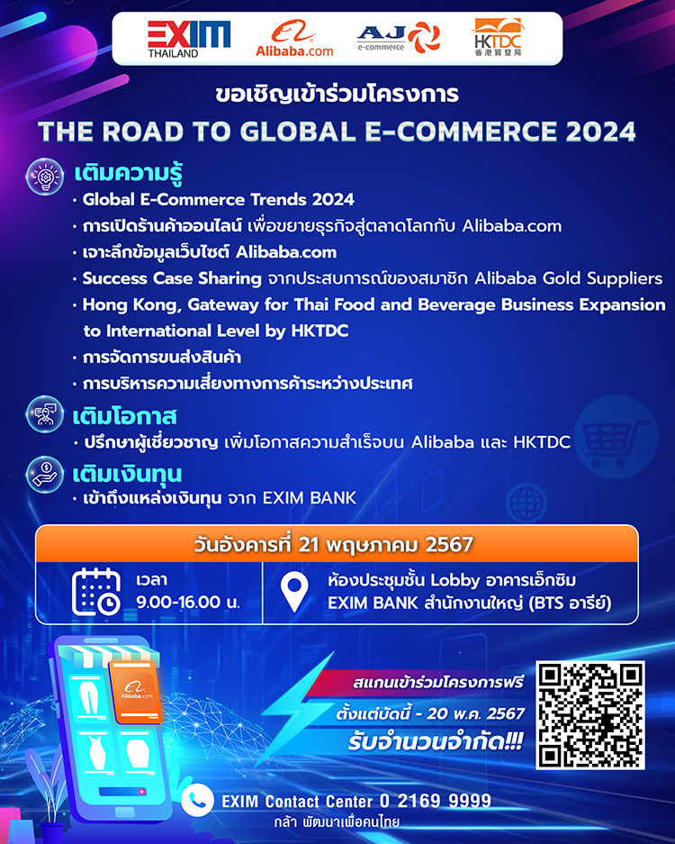 ขอเชิญผู้ประกอบการที่สนใจขยายธุรกิจสู่ตลาดการค้าออนไลน์ระดับโลกเข้าร่วมอบรมโครงการ “The Road to Global E-Commerce 2024” จัดโดยธนาคารเพื่อการส่งออกและนำเข้าแห่งประเทศไทย (EXIM BANK) ร่วมกับ Ablibaba, AJ e-commerce, Hong Kong Trade Development Council (HKTDC) ในวันอังคารที่ 21 พฤษภาคม 2567 เวลา 9.00-16.00 น. ณ EXIM BANK สำนักงานใหญ่