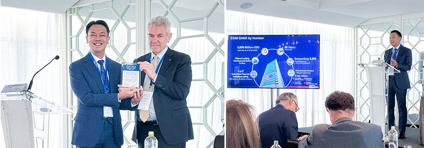 ดร.รักษ์ วรกิจโภคาทร กรรมการผู้จัดการ ธนาคารเพื่อการส่งออกและนำเข้าแห่งประเทศไทย (EXIM BANK) พร้อมด้วยผู้บริหาร EXIM BANK ถ่ายภาพร่วมกับนายเบอนัว เด เครซันเยอร์ ประธานเจ้าหน้าที่บริหาร Allianz Trade Reinsurance และประธานคณะกรรมการบริหาร International Credit Insurance & Surety Association (ICISA) ในโอกาส EXIM BANK เข้าร่วมการประชุมประจำปี ICISA ซึ่งมีผู้แทนองค์กรรับประกันจากภาครัฐและเอกชน และองค์กรรับประกันต่อกว่า 55 แห่งทั่วโลก ณ เมืองมาดริด ประเทศสเปน เมื่อวันที่ 5-7 มิถุนายน 2567 ในฐานะสมาชิกใหม่ในการประชุมครั้งนี้ EXIM BANK ได้แลกเปลี่ยนข้อมูลต่อที่ประชุม ICISA เกี่ยวกับนโยบายและทิศทางการดำเนินงานของ EXIM BANK ในฐานะ Green Development Bank พร้อมทั้งแนวโน้มธุรกิจรับประกันการส่งออกและการลงทุน ตลอดจนบริการประกันต่อ ซึ่งเป็นเครื่องมือสำคัญในการบริหารความเสี่ยงทางการค้าและการลงทุนให้กับผู้ประกอบการไทย เสริมสร้างความมั่นใจให้แก่ผู้ส่งออกและนักลงทุนไทยในการขยายธุรกิจที่เป็นประโยชน์ต่อการพัฒนาอย่างยั่งยืนในระดับประเทศและโลกโดยรวม