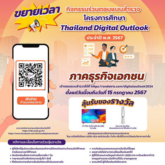ทั้งนี้การประมวลผลข้อมูลส่วนบุคคลของท่านจะถูกเก็บเป็นความลับนำไปใช้ เพื่อประโยชน์ของการศึกษาและวิจัยเท่านั้น และเป็นไปตามเป็นไปตาม พ.ร.บ. คุ้มครองข้อมูลส่วนบุคคล พ.ศ. 2562 และลุ้นรับของรางวัลได้แก่ Iphone 15 pro 128 gb มูลค่า 41,900 บาท* จำนวน 1 รางวัล, Ipad gen 10 64 gb มูลค่า 14,900 บาท* จำนวน 1 รางวัล, ทองคำแผ่น 1 สลึง มูลค่า ณ 21 มิ.ย. 2567 10,488 บาท* จำนวน 2 รางวัล และของรางวัลอื่น ๆ อีกมากมาย โดยจะประกาศรายชื่อผู้ได้รับรางวัลในวันที่ 30 สิงหาคม 2567 บนเว็บไซต์ https://www.facebook.com/thailanddigitaloutlook/ และติดตามข้อมูลข่าวสารได้ที่ https://tdo.onde.go.th/