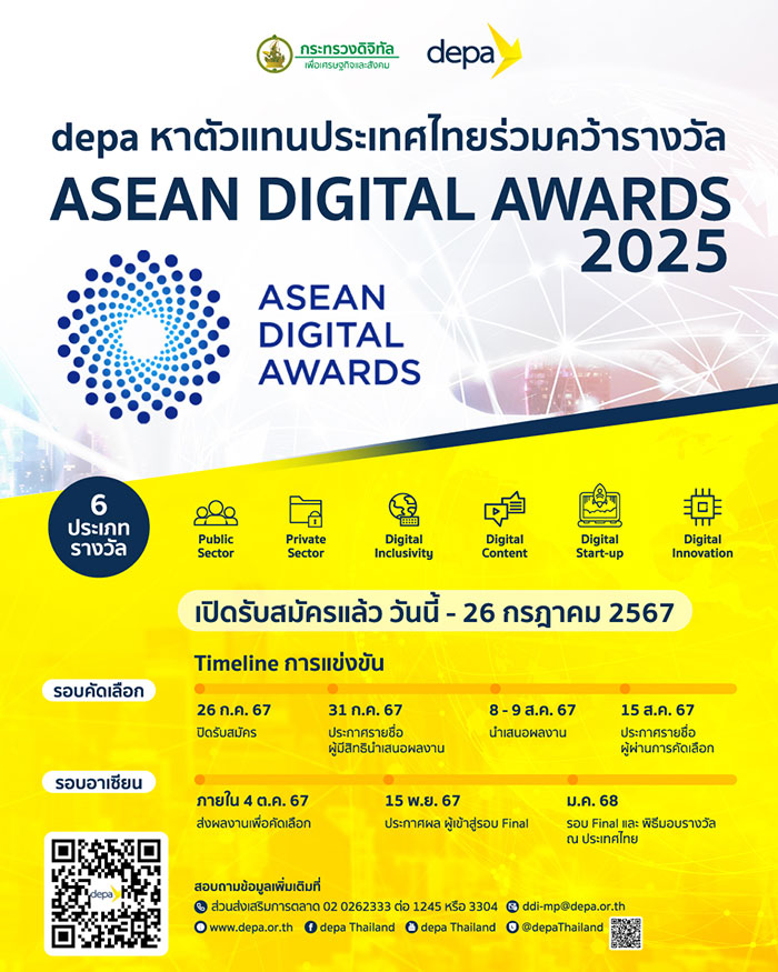 ทั้งนี้ ดีป้า และผู้ทรงคุณวุฒิจากหลากหลายสาขาจะร่วมคัดเลือกและพิจารณาผู้สมัครจากการนำเสนอผลงานดิจิทัลต่อคณะกรรมการภายในประเทศ เพื่อให้ได้มาซึ่งผลงานที่เหมาะสมในแต่ละด้าน และเป็นตัวแทนประเทศไทยเข้าร่วมในโครงการ ASEAN DIGITAL AWARDS 2025 ที่ประเทศไทยเป็นเจ้าภาพ ซึ่งผู้ที่สนใจสามารถศึกษารายละเอียดเพิ่มเติมและส่งใบสมัครได้ที่ https://www.depa.or.th/th/asean-digital-awards ตั้งแต่วันนี้ – 26 กรกฎาคมนี้