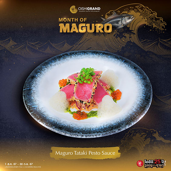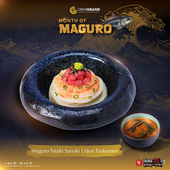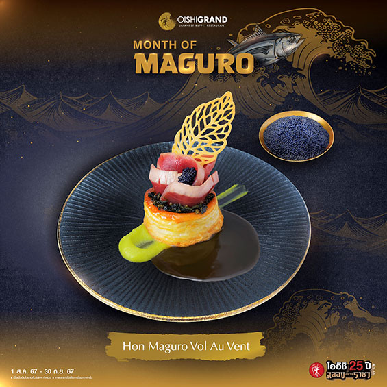 อิ่ม โอ-ร่อย เทศกาล “MONTH OF MAGURO” พร้อมอาหารจานพิเศษในธีม “EAT LIKE A KING” ขอแนะนำ สารพัดเมนูมากุโระ เนื้อแน่น สด ใหม่ แบบฉบับ เชฟบิ๊ก ท็อปเชฟ ประเทศไทย ได้แก่ “Maguro Tartar Sanuki Udon Tsukemen” (มากุโระทาร์ทาร์ซานุกิอุด้งทสึเคเมน) เสิร์ฟมากุโระในรูปแบบทาร์ทาร์ มาบนซอสเมนไทโกะ และซานุกิอุด้ง พอจะรับประทานก็เพียงแค่จุ่มน้ำซุปสาหร่าย – ดาชิ ตามสไตล์ทสึเคเมน ให้รสชาติยิ่งล้ำลึกในทุกคำ, “Maguro Tataki Pesto Sauce” (มากุโระทาทากิซอสเพสโต้) สัมผัสรสชาติมากุโระย่างสไตล์ทาทากิ เนื้อฉ่ำ...หวาน เสิร์ฟมาพร้อมซอสชิโซะเพสโต้ และโฟมจินเจอร์ยูซุ เพิ่มความสดชื่น รับประทานพร้อมกิมจิโคลสลอว์ ช่วยชูรสชาติให้พิเศษขึ้นไปอีก, และที่ถือว่าเป็นทีเด็ด คือ “Hon Maguro Vol Au Vent” (ฮอนมากุโระโวโลวองท์) นำเสนอความพิเศษของฮอนมากุโระ (ปลาทูน่าครีบน้ำเงิน) สด ฉ่ำ พร้อมคาเวียร์ จัดเสิร์ฟบนแป้งพายโวโลวองท์ อัดแน่นด้วยไส้เห็ดดุ๊กเซลล์ ที่ผัดและปรุงรสชาติมาอย่างกลมกล่อม รับประทานกับอะโวคาโดเพียวเร่ และซอสดาชิ ให้รสสัมผัสที่ล้ำเลิศ
