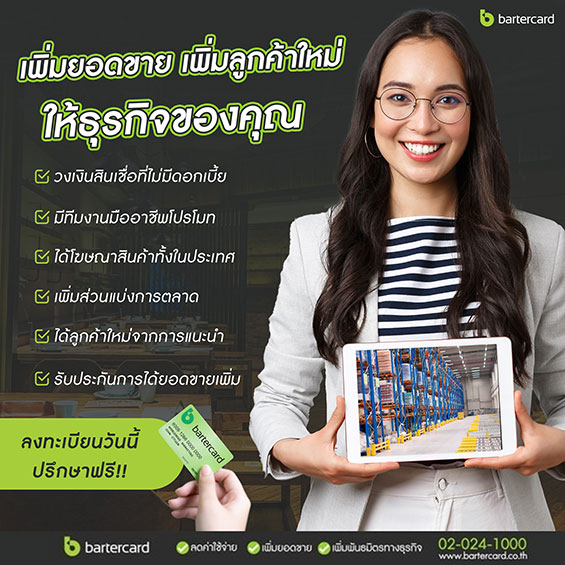 สำหรับผู้ประกอบการที่สนใจอยากให้บาร์เทอร์คาร์ด เป็นตัวกลางในการต่อยอดธุรกิจให้เติบโตอย่างไม่มีสะดุด สามารถสมัครสมาชิกกับ Bartercard หรือติดต่อสอบถามข้อมูลเพิ่มเติมได้ที่ โทร. 02-024-1000 และ Facebook: Bartercard Thailand หรือ เว็บไซต์ https://www.bartercard.co.th