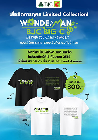 นอกจากนี้ภายในงาน กลุ่มบีเจซี บิ๊กซี ได้จัดทำเสื้อยืดลาย Limited Edition มี 2 สี คือ สีขาว และสีดำ จำหน่ายในราคาเพียง 300 บาทเท่านั้น! เพื่อนำรายได้สมทบทุนช่วยเหลือผู้ประสบภัยน้ำท่วมต่อไป และสามารถร่วมบริจาคเงินช่วยเหลือผู้ประสบภัยน้ำท่วม ได้ที่ มูลนิธิ บีเจซี บิ๊กซี ธนาคารกสิกรไทย เลขที่บัญชี 033-8-08520-6 (การบริจาคสามารถนำไปลดหย่อนภาษีได้)
