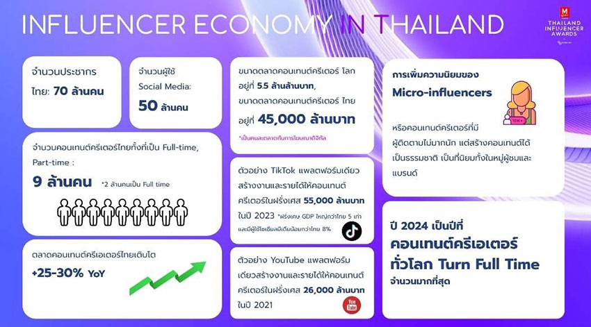 นางสาวสุวิตา จรัญวงศ์ ประธานกรรมการบริหาร และผู้ร่วมก่อตั้ง บริษัท เทลสกอร์ จำกัด เปิดเผยว่า จากสถิติของ Linktree พบว่าปัจจุบันมีคอนเทนต์ ครีเอเตอร์ประมาณ 200 ล้านคนทั่วโลก หรือประมาณ 3% จากประชากรโลก สำหรับในประเทศไทยคาดว่ามีคอนเทนต์ ครีเอเตอร์มากถึง 9 ล้านคน ครอบคลุมตั้งแต่ในระดับ Nano - Macro - Mega Creator ทั้งที่เป็น Full-time และ Part time ซึ่งสอดคล้องกับพฤติกรรมการใช้โซเชียลมีเดียและการใช้เวลาท่องโลกออนไลน์ของคนไทยที่มีอัตราสูงในอันดับต้นๆ ของโลก โดยจากข้อมูลจากสำนักงานคณะกรรมการดิจิทัลเพื่อเศรษฐกิจและสังคมแห่งชาติ (สดช.) พบว่าประชากรไทยมีการอัตราการเข้าถึงอินเตอร์เน็ตอยู่ที่ประมาณ 89.5% และมีช่องทางโซเชียลมีเดียมากถึง 50 ล้านคน คิดเป็น 71.5% ของประชากรทั้งหมด