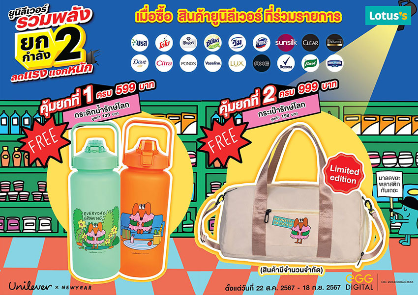 - เมื่อซื้อสินค้ายูนิลีเวอร์ที่ร่วมรายการที่โลตัส ต่อที่หนึ่งครบ 599 บาท รับฟรีกระติกน้ำรักษ์โลก ต่อที่สองครบ 999 บาท รับฟรีกระเป๋าผ้ารักษ์โลก ลาย Wednesday จาก Newyear ศิลปินลายเส้นสุดฮอต (ของแถมมีจำนวนจำกัด)