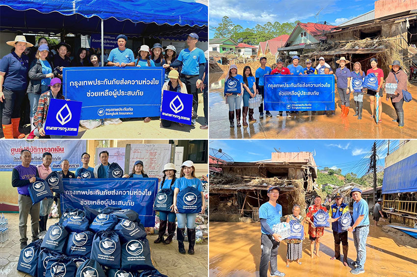 บริษัท กรุงเทพประกันภัย จำกัด (มหาชน) เร่งให้ความช่วยเหลือผู้ประสบอุทกภัยอย่างต่อเนื่อง โดยนายอลงกรณ์ กาศทิพย์ ผู้จัดการภาคเหนือ ธุรกิจสาขาและการร่วมทุน ร่วมกับนายนพรัตน์ คงศรีเจริญ ผู้จัดการสาขาแม่สาย ธนาคารกรุงเทพ จำกัด (มหาชน) นำพนักงานจิตอาสาของทั้ง 2 องค์กร ลงพื้นที่มอบถุงยังชีพรวมจำนวนทั้งสิ้น 350 ชุด ซึ่งบรรจุข้าวสารอาหารแห้ง ของใช้ในชีวิตประจำวันที่จำเป็น และน้ำดื่ม ให้แก่ผู้ประสบอุทกภัยในหลายพื้นที่ ได้แก่ เทศบาลตำบลแม่สาย ศูนย์ผู้ประสบภัยตำบลเกาะช้าง โรงพยาบาลส่งเสริมสุขภาพตำบลเกาะช้าง โรงเรียนปิยะพรพิทยา และหมู่บ้านวัดถ้ำผาจม เพื่อเร่งบรรเทาความเดือดร้อนและส่งต่อความช่วยเหลือให้แก่ผู้ที่ได้รับผลกระทบจากเหตุการณ์ดังกล่าวในพื้นที่อำเภอแม่สาย จังหวัดเชียงราย เมื่อวันที่ 15 กันยายน 2567
