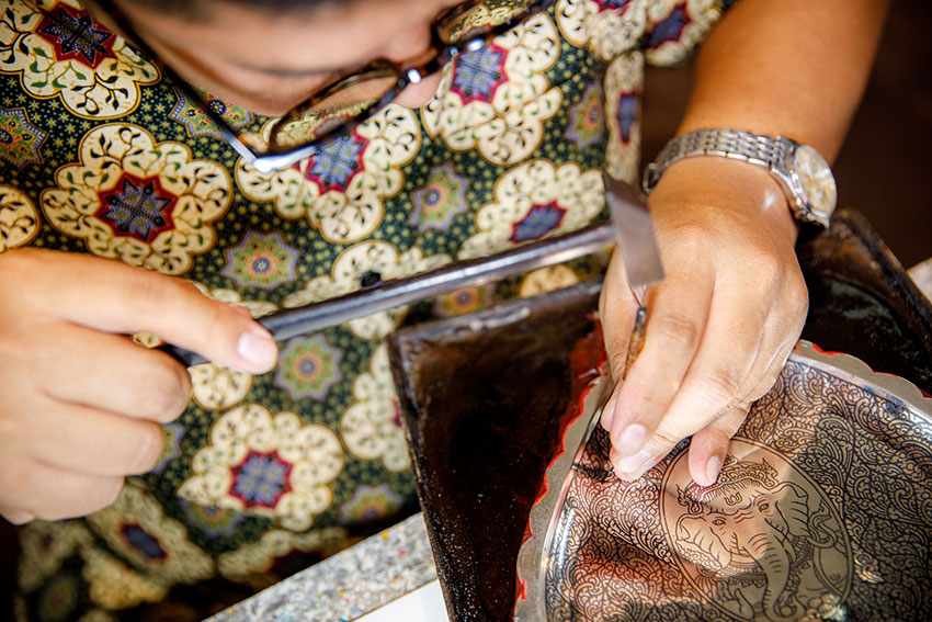 5. จังหวัดนครศรีธรรมราช (แดนถมนคร) ภายใต้แนวคิด “Nakorn Sri Reserve : ขลังนคร” งานถมนคร ศิลปะโบราณที่สร้างสรรค์ลวดลายสีเงินและดำอันประณีต เป็นงานศิลปหัตถกรรมชั้นสูงที่คนนครศรีธรรมราชและคนไทยภาคภูมิใจมาตั้งแต่สมัยโบราณ ต้องรักษาให้คงอยู่ในบริบทปัจจุบัน โดยประยุกต์ใช้เทคนิคและพัฒนารูปแบบผลิตภัณฑ์เชิงพาณิชย์ ทำให้เกิดรูปแบบที่มีทั้งความสวยงาม ร่วมสมัย มีคุณค่า และยังคงความเป็นอัตลักษณ์จากภูมิปัญญาดั้งเดิม