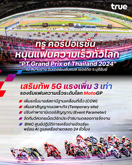 ทรู คอร์ปอเรชั่น เดินหน้าสนับสนุนการจัดงานระดับโลก "PT Grand Prix of Thailand 2024" หรือ "ไทยแลนด์ โมโตจีพี 2024" ศึกชิงเจ้าแห่งความเร็ว ณ สนามช้าง อินเตอร์เนชั่นแนล เซอร์กิต จ.บุรีรัมย์ ระหว่างวันที่ 25-27 ตุลาคม 2567 ด้วยการขยายสัญญาณ 5G และ 4G เพิ่มอีก 3 เท่า พร้อมรองรับการจัดงาน และผู้ชมชาวไทยและต่างชาติเข้าชมมากกว่าแสนคนต่อวัน โดยเฉพาะผู้ชื่นชอบความเร็วที่ติดตามการแข่งขัน MotoGP ประจำปี โดยการจัดครั้งนี้ที่ จ.บุรีรัมย์ ประเทศไทยนับเป็นสนามที่ 20 จากจำนวนทั้งหมด 22 สนามทั่วโลกของปี 2567
