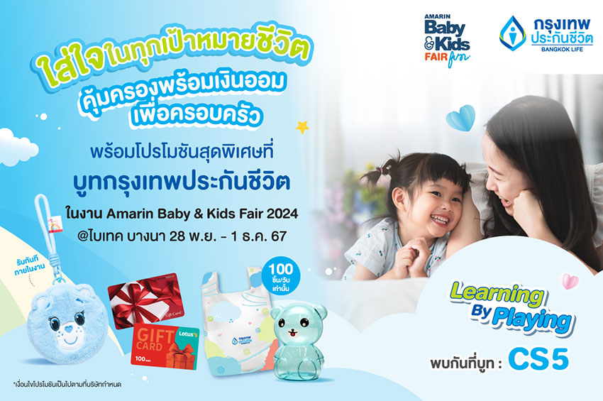 คุณพ่อคุณแม่ที่สนใจ สามารถพบกับแผนความคุ้มครองที่คัดสรรมาด้วยความใส่ใจ ตอบโจทย์ความต้องการทุกครอบครัวจากกรุงเทพประกันชีวิตได้ในงาน Amarin Baby & Kids Fair 2024 ได้ในระหว่างวันที่ 28 พฤศจิกายน ถึง 1 ธันวาคม ศกนี้ ที่ ไบเทค บางนา ฮอลล์ 103-104 บูท CS5 ระหว่าง 10.00 – 20.00 น. พบกับกิจกรรมเสริมสร้างพัฒนาการเรียนรู้ของลูกน้อย การวางแผนเตรียมพร้อมด้านสุขภาพ ค่ารักษาพยาบาล และเตรียมเงินออมเพื่อเป็นทุนการศึกษาให้ลูกรัก พร้อมให้คำปรึกษาวางแผนการเงินกับคุณพ่อคุณแม่ตามเป้าหมายที่ต้องการ พิเศษในวันเสาร์ที่ 30 พฤศจิกายน เวลา 13:30 น. ร่วมฟังเสวนาห้องเรียนพ่อแม่ โดย ผศ.ดร.ปนัดดา ธนเศรษฐกร ผู้เชี่ยวชาญด้านเทคนิคการสร้างวินัยเชิงบวกและการส่งเสริมทักษะสมอง EF สถาบันแห่งชาติเพื่อการพัฒนาเด็กและครอบครัว มหาวิทยาลัยมหิดล พร้อมโปรโมชันสุดพิเศษภายในงาน และโปรโมชันอื่น ๆ อีกมากมายศึกษาเพิ่มเติมได้ที่ https://www.bangkoklife.com/th/promotion