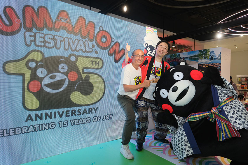 นายกฤษณ์ สกุลพาณิช (คนแรกซ้าย) ประธานบริหารสูงสุด บริษัท (เดกซ์) ดรีม เอกซ์เพรส จำกัด และ มร. ทาคาชิ คิมูระ (ที่ 2 จากขวา) ผู้ว่าราชการจังหวัดคุมาโมโตะ พร้อมด้วย “คุมะมง” ผู้บริหารด้านการตลาดและตัวแทนความสุขประจำจังหวัดคุมาโมโตะ จับมือ มร. อัตสึชิ โอะคูโมริ (ที่ 2 จากซ้าย) กรรมการผู้จัดการ บริษัท สยาม ทาคาชิมายะ (ประเทศไทย) จำกัด และ มร. จิโร โทมินากะ รองผู้จัดการทั่วไปฝ่ายธุรกิจต่างประเทศของบริษัท ADK Emotions, Inc. ร่วมฉลอง ครบรอบ 15 ปี คุมะมง ภายใต้กิจกรรม “Kumamon Festival Celebrating 15 Years of Joy” บริเวณ Event Space ชั้น 4 ณ ห้างสรรพสินค้าสยาม ทาคาชิมายะ ไอคอนสยาม