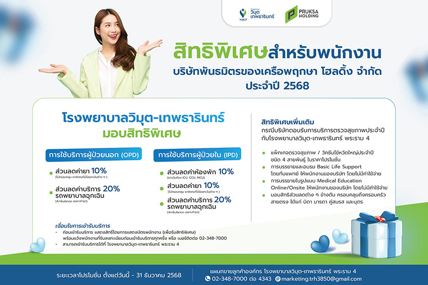 “ปี 2568 นี้ พฤกษา โฮลดิ้ง เดินหน้าส่งเสริมคุณภาพชีวิตที่ดีให้กลุ่มผู้บริหาร พนักงานบริษัท และลูกค้าขององค์กรพันธมิตรที่เข้าร่วมโครงการพันธมิตรของเครือพฤกษา โดยผนึกความร่วมมือระหว่าง 3 บริษัทในเครือ ได้แก่ พฤกษา เรียลเอสเตท โรงพยาบาลวิมุต และโรงพยาบาลวิมุต-เทพธารินทร์ ร่วมมอบเอ็กซ์คลูซีฟดีลซื้อที่อยู่อาศัยที่มีคุณภาพ และสิทธิ์เข้าถึงการดูแลรักษาสุขภาพเพื่อมีคุณภาพชีวิตที่ดีขึ้นอย่างยั่งยืน ตอกย้ำแนวคิด “อยู่ดี มีสุข” (Live well, Stay well) ที่บริษัทยึดมั่นในการดำเนินธุรกิจเสมอมา”