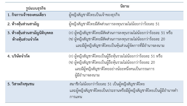 สำหรับนิยามผู้ประกอบการสตรีเอสเอ็มอีประกอบด้วย 1. กิจการเจ้าของคนเดียว หมายถึง กิจการที่ผู้หญิงสัญชาติไทยเป็นเจ้าของธุรกิจ 2. ห้างหุ้นส่วนสามัญ หมายถึง กิจการที่ผู้หญิงสัญชาติไทยมีสัดส่วนการลงทุนรวมไม่น้อยกว่าร้อยละ 51 3. ห้างหุ้นส่วนสามัญนิติบุคคล/ ห้างหุ้นส่วนจำกัด แบ่งเป็น 2 รูปแบบ ได้แก่ (ก) กิจการที่ผู้หญิงสัญชาติไทยมีสัดส่วนการลงทุนรวมไม่น้อยกว่าร้อยละ 51 หรือ (ข) กิจการที่ผู้หญิงสัญชาติไทยมีสัดส่วนการลงทุนรวมไม่น้อยกว่าร้อยละ 20 และมีผู้หญิงสัญชาติไทยเป็นหุ้นส่วนผู้จัดการที่มีอำนาจลงนาม 4. บริษัทจำกัด แบ่งเป็น 2 รูปแบบ ได้แก่ (ก) กิจการที่ผู้หญิงสัญชาติไทยเป็นผู้ถือหุ้นรวมไม่น้อยกว่าร้อยละ 51 หรือ (ข) กิจการที่ผู้หญิงสัญชาติไทยเป็นผู้ถือหุ้นรวมไม่น้อยกว่าร้อยละ 20 และมีผู้หญิงสัญชาติไทยอย่างน้อยหนึ่งคนเป็นกรรมการผู้มีอำนาจลงนาม 5. วิสาหกิจชุมชน หมายถึง มีสมาชิกไม่น้อยกว่าร้อยละ 51 เป็นผู้หญิงสัญชาติไทย และผู้หญิงสัญชาติไทยเป็นประธานหรือมีผู้หญิงสัญชาติไทยเป็นผู้มีอำนาจทำการแทน