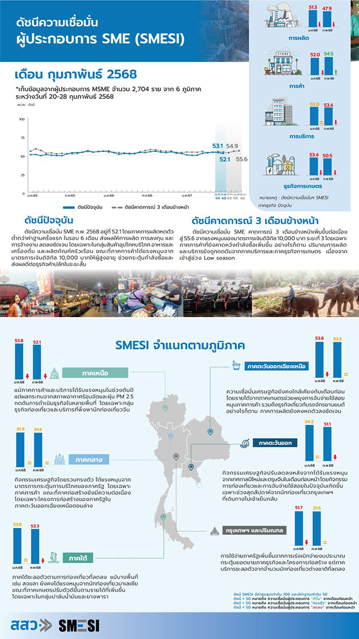 สำหรับดัชนีความเชื่อมั่นผู้ประกอบการ SME (SMESI) รายภูมิภาค พบว่า ภาคตะวันออก อยู่ที่ระดับ 51.1 ลดลงจากเดือนก่อนหน้าที่ระดับ 54.2 ผลจากกิจกรรมทางเศรษฐกิจที่ปรับลดลงชัดเจน จากการเร่งตัวสูงของนักท่องเที่ยวทั้งในและต่างประเทศ ในช่วงเทศกาลปีใหม่ รวมถึงตรุษจีนในเดือนก่อนหน้า ขณะที่กิจกรรมการท่องเที่ยวและการจับจ่ายใช้สอยเกิดขึ้นเฉพาะช่วงสุดสัปดาห์จากนักท่องเที่ยวที่มาจากกรุงเทพฯ ในรูปแบบไปเช้าเย็นกลับเท่านั้น ภาคเหนือ อยู่ที่ระดับ 52.1 ลดลงจากเดือนก่อนหน้าที่ระดับ 53.8 แม้จะได้รับแรงหนุนจากภาคการค้าและภาคบริการในช่วงต้นปี แต่ผลกระทบจากสภาพอากาศที่ร้อนจัดและปัญหาฝุ่น PM 2.5 ส่งผลต่อการดำเนินธุรกิจในพื้นที่ ทำให้ความเชื่อมั่นชะลอตัว โดยเฉพาะในกลุ่มธุรกิจท่องเที่ยวและบริการที่พึ่งพาการเดินทางของนักท่องเที่ยวจีน ภาคใต้ อยู่ที่ระดับ 52.3 ปรับตัวลดลงจากเดือนก่อนหน้าที่ระดับ 53.8 เศรษฐกิจภาคใต้ชะลอตัวตามจำนวนนักท่องเที่ยวที่ลดลง ส่งผลให้กิจกรรมการท่องเที่ยวแผ่วลงเมื่อเปรียบเทียบกับเดือนก่อน แม้บางพื้นที่ เช่น สงขลา ยังได้รับแรงหนุนจากนักท่องเที่ยวมาเลเซีย ขณะที่ภาคธุริจการเกษตรปรับตัวดีขึ้นตามรายได้ภาคการเกษตรที่เพิ่มขึ้น ในกลุ่มปาล์มน้ำมันและยางพาราเป็นสำคัญ ภาคกลาง อยู่ที่ระดับ 51.6 ลดลงเล็กน้อยจากเดือนก่อนหน้าที่ระดับ 51.9 โดยการจับจ่ายใช้สอยจากรายได้ภาคการเกษตรยังเป็นปัจจัยพยุงเศรษฐกิจในพื้นที่ สร้างผลดีกับภาคการค้า และบริการที่เกี่ยวข้องกับรถจักรยานยนต์อย่างต่อเนื่อง ในขณะที่ภาคการผลิตหดตัวลงชัดเจน ภาคตะวันออกเฉียงเหนือ อยู่ที่ระดับ 53.5 ปรับตัวลดลงจากเดือนก่อนหน้าที่ระดับ 53.8 กิจกรรมทางเศรษฐกิจในพื้นที่อยู่ในระดับทรงตัว โดยได้รับแรงหนุนจากมาตรการกระตุ้นการบริโภคของภาครัฐ ซึ่งช่วยพยุงกิจกรรมทางเศรษฐกิจ โดยเฉพาะในภาคการค้า นอกจากนี้ ภาคการก่อสร้างยังคงให้บริการอย่างต่อเนื่อง โดยเฉพาะโครงการก่อสร้างของภาครัฐในพื้นที่ภาคตะวันออกเฉียงเหนือตอนล่าง เขตกรุงเทพฯ และปริมณฑล อยู่ที่ระดับ 51.5 ลดลงจากเดือนก่อนหน้าที่ระดับ 51.7 การเร่งเบิกจ่ายงบผูกพันของปีงบประมาณ พ.ศ. 2567-2568 ที่ต้องสิ้นสุดภายในไตรมาสที่ 1 เร่งการใช้จ่ายภาครัฐมากขึ้น ส่งผลต่อยอดขายของภาคธุรกิจในพื้นที่ รวมถึงโครงการก่อสร้างภาครัฐที่มีอย่างต่อเนื่อง อย่างไรก็ตามภาคการบริการชะลอลงตามการลดลงของนักท่องเที่ยวต่างชาติ