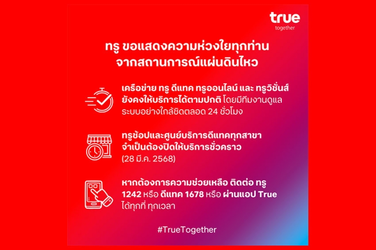 อย่างไรก็ตาม ศูนย์บริการทรูและดีแทคช้อปจะงดให้บริการชั่วคราว เพื่อดำเนินการตรวจสอบความปลอดภัยของสถานที่อย่างละเอียด โดยทรูให้ความสำคัญสูงสุดต่อความปลอดภัยของทั้งลูกค้าและพนักงาน โดยจะเปิดให้บริการอีกครั้งในวันพรุ่งนี้ (29 มีนาคม 2568) สำหรับศูนย์บริการฯที่อยู่ภายในศูนย์การค้า จะเปิดให้บริการตามนโยบายการเปิดให้บริการของศูนย์การค้า ทั้งนี้ ลูกค้าสามารถใช้บริการหลังการขายผ่านแอปพลิเคชันของทรู หรือคอลเซ็นเตอร์ ทรู 1242 และ ดีแทค 1678 ได้ตามปกติ