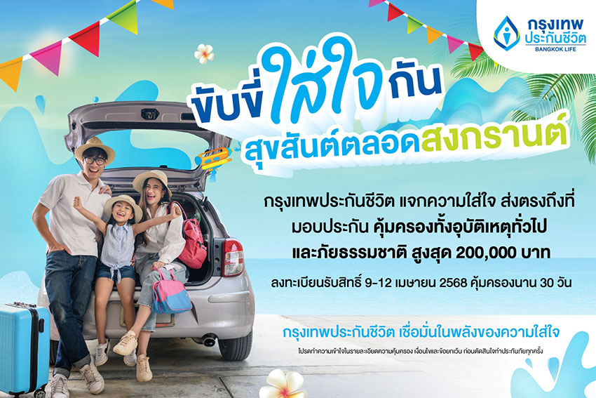 กรุงเทพประกันชีวิตเชื่อมั่นในพลังของความใส่ใจ เนื่องในเทศกาลสงกรานต์ซึ่งเป็นช่วงเวลาแห่งความสุขของคนไทยขอส่งความใส่ใจและมอบความอุ่นใจให้กับทุกคนที่เดินทางด้วยแคมเปญ "ขับขี่ใส่ใจกัน สุขสันต์ตลอดสงกรานต์" โดยเฉพาะผู้ขับขี่ และผู้รับหน้าที่เป็นมือขับรถประจำบ้าน ด้วยประกันอุบัติเหตุ (PA) คุ้มครองทั้งอุบัติเหตุทั่วไปและภัยธรรมชาติ สูงสุด 200,000 บาท เพียงลงทะเบียนผ่านการสแกน QR Code ระหว่าง 9-12 เมษายนนี้ ณ จุดต่าง ๆ ที่เป็นเส้นทางสัญจรทั้งในกรุงเทพฯ และทุกภูมิภาค สำหรับลูกค้า และ บุคลากรทั้งพนักงาน ตัวแทนฯ มอบความคุ้มครองประกันอุบัติเหตุให้ฟรีสูงสุด 100,000 บาท รวมระยะเวลาคุ้มครอง 30 วัน