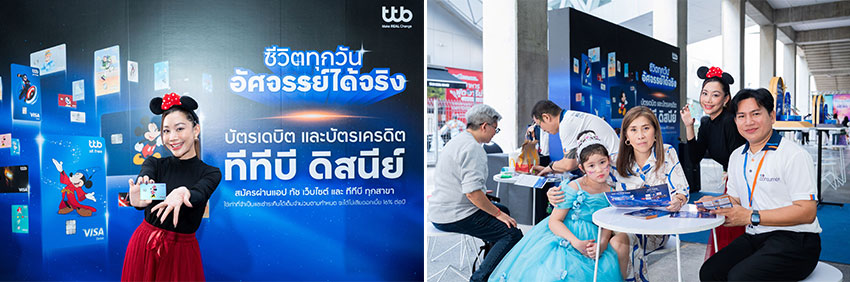 ตลอดช่วงจัดงานทั้ง 4 วัน ทีทีบีได้ร่วมออกบูทเพื่อส่งมอบประสบการณ์ความคุ้มค่าในทุก ๆ วัน และมอบสิทธิประโยชน์สุดพิเศษที่ตอบโจทย์ไลฟ์สไตล์ ทั้งความบันเทิง กิน-เที่ยว-ช้อป ให้กับลูกค้าที่มาสมัครบัตร ทีทีบี ดิสนีย์ ไม่ว่าจะเป็นเงินคืนสูงสุด 2% เมื่อใช้จ่ายออนไลน์ผ่านบัตรเดบิต การรับคะแนนสะสมสูงสุด 5 เท่า รวมถึงรับสิทธิ์แบ่งจ่าย 0% นานสูงสุด 6 เดือน กับร้านค้าดิสนีย์ที่ร่วมรายการและการจองกิจกรรมดิสนีย์ผ่าน Klook โดยทำรายการผ่านบริการ ttb so goood บนแอป ทีทีบี ทัช สำหรับบัตรเครดิต โดยความพิเศษของบัตร ทีทีบี ดิสนีย์ ไม่ได้มีแค่สิทธิประโยชน์ด้านการใช้จ่าย แต่ยังโดดเด่นด้วยดีไซน์หน้าบัตรที่ออกแบบจากคาแรกเตอร์ยอดนิยมของ ดิสนีย์ พิกซาร์ มาร์เวล และสตาร์ วอร์ส มีให้เลือกมากถึง 20 ลาย พร้อมด้วยลาย Limited Edition อย่าง Captain America และ Brave New World ซึ่งได้รับความสนใจอย่างต่อเนื่อง และอีกหนึ่งกิจกรรมไฮไลต์ “Meet & Greet กับ Mickey และ Minnie” ที่ได้สร้างความประทับใจเป็นอย่างมากให้กับลูกค้าที่สมัครบัตรเดบิตและบัตรเครดิต ทีทีบี ดิสนีย์ ได้รับสิทธิ์ร่วมกิจกรรมแบบใกล้ชิดกับคาแรกเตอร์อันเป็นที่รัก