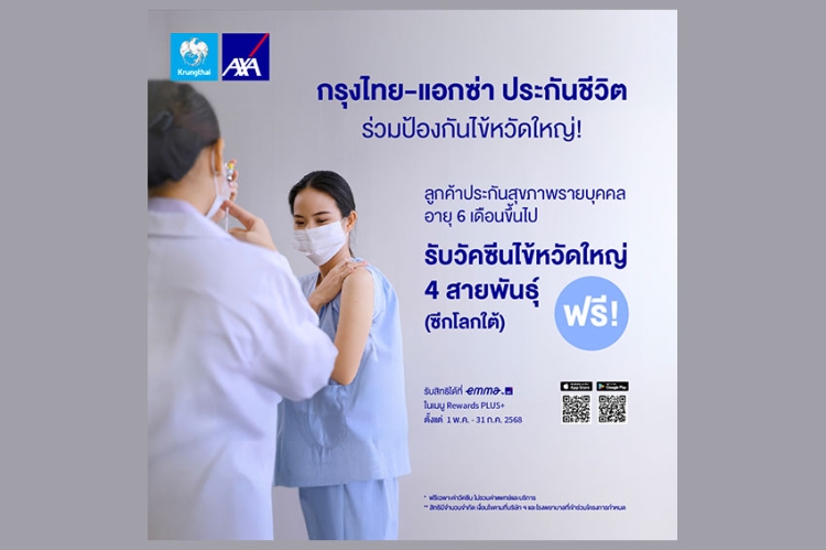 บมจ.กรุงไทย-แอกซ่า ประกันชีวิต เล็งเห็นความสำคัญในการดูแลสุขภาพเชิงป้องกัน จัดทำกิจกรรม “ร่วมป้องกันคนที่คุณรักจากโรคไข้หวัดใหญ่ ฟรีค่าวัคซีน 2568” ขึ้น โดยบริษัท ฯ ขอมอบสิทธิการเข้ารับการฉีดวัคซีนป้องกันไข้หวัดใหญ่ 4 สายพันธุ์ (ซีกโลกใต้) จำนวน 1 เข็ม ต่อผู้เอาประกันภัยที่ได้รับสิทธิ 1 ราย โดยไม่มีค่าใช้จ่ายในส่วนของค่าวัคซีน ทั้งนี้การฉีดวัคซีนป้องกันโรคไข้หวัดใหญ่ เป็นวิธีที่มีประสิทธิภาพที่สุดในการป้องกันโรคนี้ ไม่เพียงแต่จะช่วยลดโอกาสติดเชื้อ แต่ยังช่วยลดความรุนแรงของอาการ และลดความเสี่ยงจากภาวะแทรกซ้อนที่อาจเกิดขึ้นได้