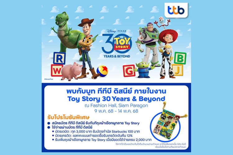 ทีเอ็มบีธนชาต หรือ ทีทีบี ตอกย้ำพันธมิตรแบงก์แรกและแบงก์เดียวในไทยที่ร่วมกับดิสนีย์สร้างสรรค์ประสบการณ์ทางการเงินสุดพิเศษผสานความสนุก ความอัศจรรย์ที่คุ้มค่ากับสิทธิประโยชน์มากมาย ในงาน “Toy Story 30 Years & Beyond” เพื่อร่วมฉลองครบรอบ 30 ปี แห่งความทรงจำของเหล่าทอยจากภาพยนตร์แอนนิเมชันระดับตำนาน ชวนแฟนคลับและคนรัก Toy Story สนุกสนานไปกับกิจกรรมพิเศษมากมาย ตามเก็บแรร์ไอเท็ม พร้อมแสดงบัตรเดบิต ทีทีบี ออลล์ฟรี ดิสนีย์ ลายหน้าบัตร “Toy Story” โดยสามารถสมัครและรับโปรโมชันสุดพิเศษได้ที่บูททีทีบีภายในงาน ตั้งแต่วันที่ 9 - 14 พฤษภาคมนี้ ณ แฟชั่นฮอลล์ ชั้น 1 สยามพารากอน