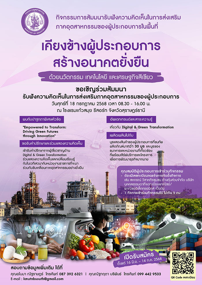 กระทรวงอุตสาหกรรม เดินหน้ายกศักยภาพภาคอุตสาหกรรม เตรียมจัดสัมมนารับฟังความคิดเห็นในการส่งเสริมภาคอุตสาหกรรมของผู้ประกอบการในพื้นที่ จังหวัดสุราษฎร์ธานี ภายใต้หัวข้อ "เคียงข้างผู้ประกอบการ สร้างอนาคตยั่งยืน" ด้วยนวัตกรรม เทคโนโลยี และเศรษฐกิจสีเขียว ณ โรงแรมแก้วสมุยรีสอร์ท จังหวัดสุราษฎร์ธานี ในวันศุกร์ที่ 18 กรกฎาคม 2568 คาดมีผู้ประกอบการเข้าร่วมกว่า 500 ราย เปิดรับสมัครแล้ววันนี้ ถึง 14 กรกฎาคม 2568