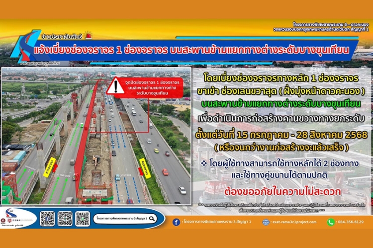 การทางพิเศษแห่งประเทศไทย (กทพ.) กระทรวงคมนาคม ขอแจ้งให้ผู้ใช้ทางทราบว่า กทพ. จะดำเนินการเบี่ยงช่องจราจรทางหลัก 1 ช่องจราจร (เลนขวาสุด) ขาเข้ามุ่งหน้าดาวคะนอง บนสะพานข้ามแยกทางต่างระดับบางขุนเทียน เพื่อดำเนินการก่อสร้างทางพิเศษสายพระราม 3 – ดาวคะนอง – วงแหวนรอบนอกกรุงเทพมหานคร ด้านตะวันตก สัญญาที่ 1 ตั้งแต่วันที่ 15 กรกฎาคม ถึงวันที่ 28 สิงหาคม 2568 หรือจนกว่างานก่อสร้างจะแล้วเสร็จ